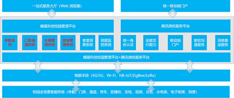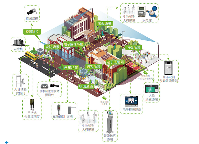 我国正处于由教育大国向教育强国迈进的攻坚期和转型期,促进高职校实现由数字化校园向智慧校园的快速转型发展,是当前诸多高职校建设的目标之一。高职校不同于K12学校的是,学校建筑规模大、在校人数多。基于此特点,熵基科技采用熵安云通智慧园区综合管理平台V8800,与腾讯微校共同打造集通道、门禁、宿管、考勤、访客、消费、安检、视频、停车场、智能水电控、电子班牌等一体化的智慧校园管理平台,推动数字校园加速向智慧校园升级。